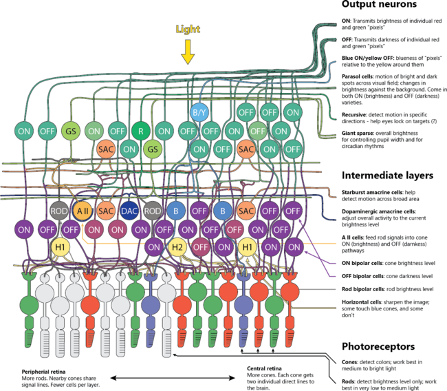 Amacrine circuits add temporal filtering, motion sensitivity, and direction selectivity. Ganglion cells compress the scene into parallel channels: high-acuity parvocellular, fast luminance magnocellular, color-opponent streams, and intrinsically photosensitive ganglion cells that carry irradiance for circadian timing and pupil control. This front-end compression lowers bandwidth while preserving behaviorally critical features. Break the ON pathway and night vision and contrast detection degrade; damage to specific amacrine circuits erases motion cues; disrupt melanopsin cells and circadian and pupil reflexes drift. Function depends on the full network.